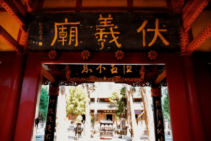 庙内古柏参天,每一处遗迹或名称,如见易亭、太昊宫、与天地准匾额,等等,莫不与伏羲、八卦息息相关。