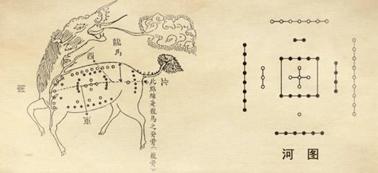传说伏羲氏时代,在黄河的河南孟津段,有龙背马身的神兽(龙马),从河中负图而出,伏羲依照龙马背上的图点,仰观天,俯察地,画出了八卦。